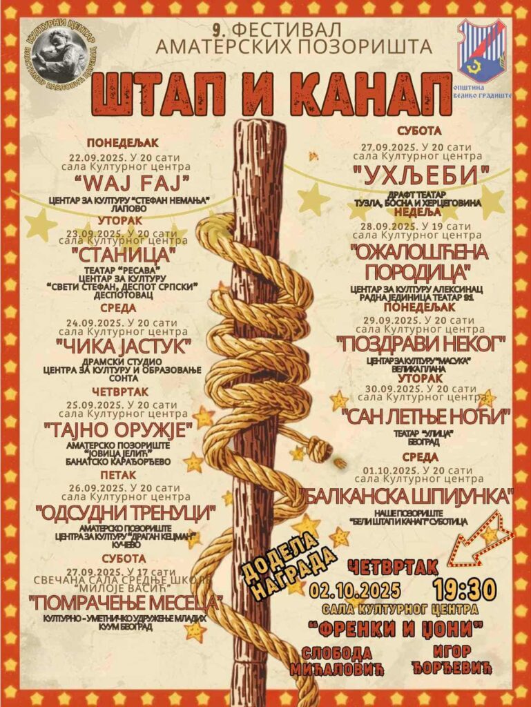 „Naše pozorište Beli štap i kanap“ doživelo je veliki uspeh – naša predstava „Balkanska špijunka“ uvrštena je u zvaničnu selekciju festivala amaterskih pozorišta „Štap i kanap“, koji se ove godine održava u Velikom Gradištu od 22. septembra do 2. oktobra 2025. godine. Ovo je prvi nastup na takmičarskom festivalu, što doživljavamo kao veliki iskorak i priznanje za dosadašnji rad.